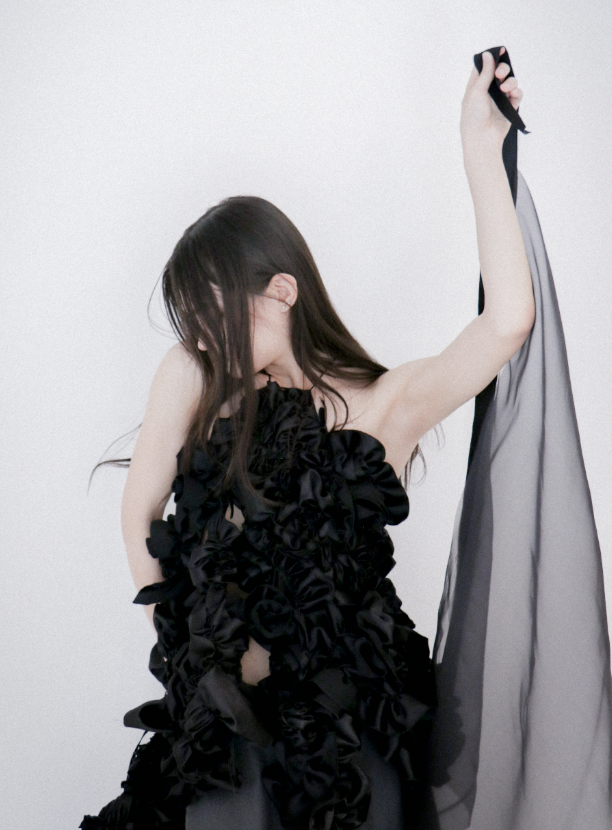 LOOK 3: BLOSSOMING AGE The “finale” of the collection is a transformative top that is made and cut in a no-waste method. The fabric is used as whole and gathered multiple times to create the illusion of a boquet of flowers. The color black represents the end of a childhood and parental attachment. We always gift boquets as a final present after a grand piano recital, this is the gift that parades the end of the childhood symphony.